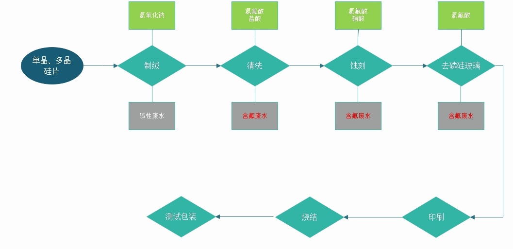 光伏行業(yè)含氟廢水主要來源于電池車間,電池車間的工藝為:制絨,擴散,濕法刻蝕,噴涂減反射膜,印刷燒結(jié)。其中硅片制絨和刻蝕兩個工序產(chǎn)生廢水,包括費酸液(硝酸+氫氟酸、氫氟酸+鹽酸或氫氟酸)、廢堿液、酸清洗水、堿清洗水。其中廢酸液和廢堿液水量較小,為間歇排放,酸清洗水和堿清洗水水量較大,水質(zhì)相對穩(wěn)定。其常見生產(chǎn)工藝為: